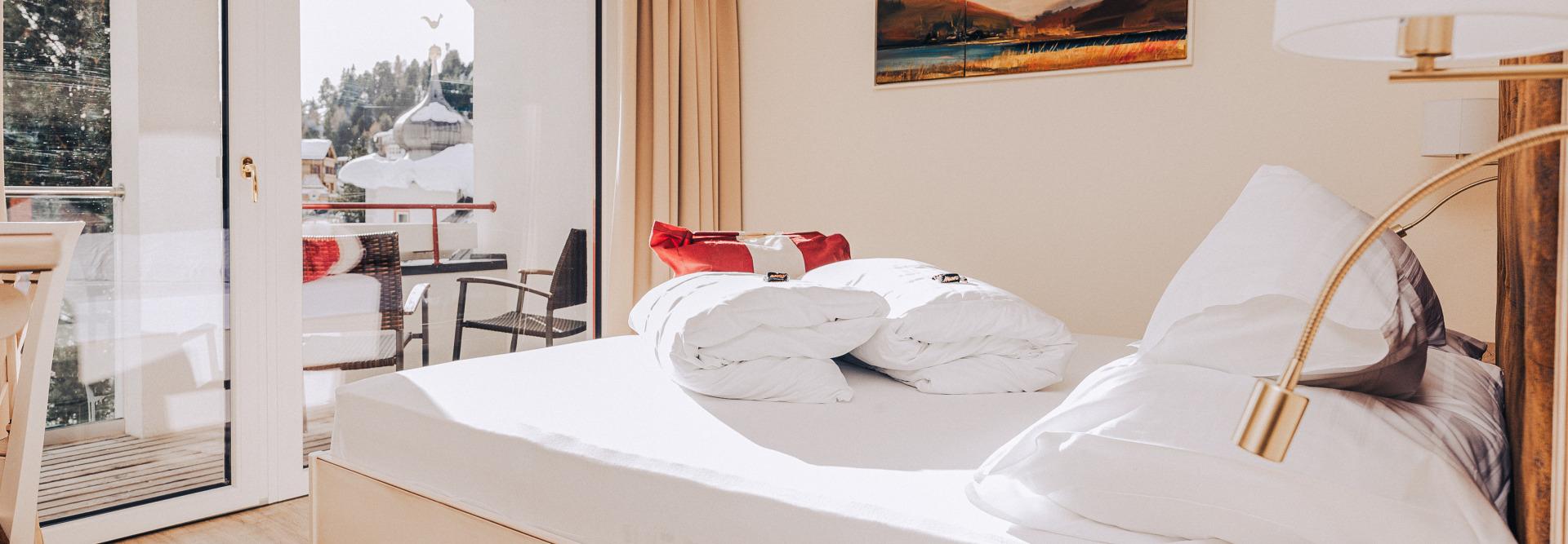 Die Einrichtung: Zeitlos elegant. Alpines Flair mit modernem Touch. Edles Holz und edle Stoff geben dem Raum seine unverkennbare Note. Der Ausblick aus den Komfort Zimmer und Suiten ist zu jeder Jahreszeit: umwerfend schön auf die unvergleichliche Natur der Turracher Höhe. Buchen Sie bei uns Ihren unvergesslichen Urlaub.