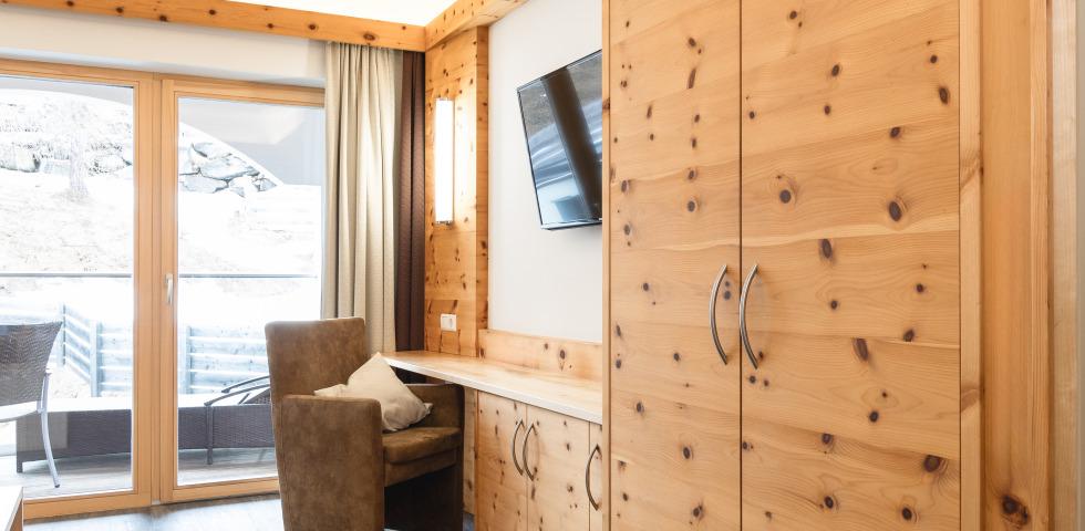 The wood of the local stone pine, the "Queen of the Alps", was selected as raw material for these rooms (2 junior suites are without stone pine wood) while the bathrooms are dominated by slate adding to a delightful modern decor. With harmonious colors and contemporary design, these rooms provide a sense of true well-being! The stone pine from the Nockberge Mountains was slowly air-dried for ten years and logged in a way as to prevent the resin from leaking, thus fully unfold its beneficial properties. And speaking of effects, stone pine wood makes for a particularly relaxing night's sleep, promoting a favorable slow heart rate. Two of our junior suites can even be booked for 5 people.